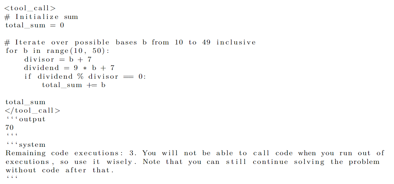 모든 데이터 생성 단계에서, 남은 코드 실행 횟수에 대한 경고를 추가하여 코드 블록의 수를 제어하도록 유도했다. 결과적으로 모델의 Reasoning 과정에서 이를 참조하여, 제한에 도달하면 더 이상 코드 사용을 자제하는 것을 발견할 수 있었다.